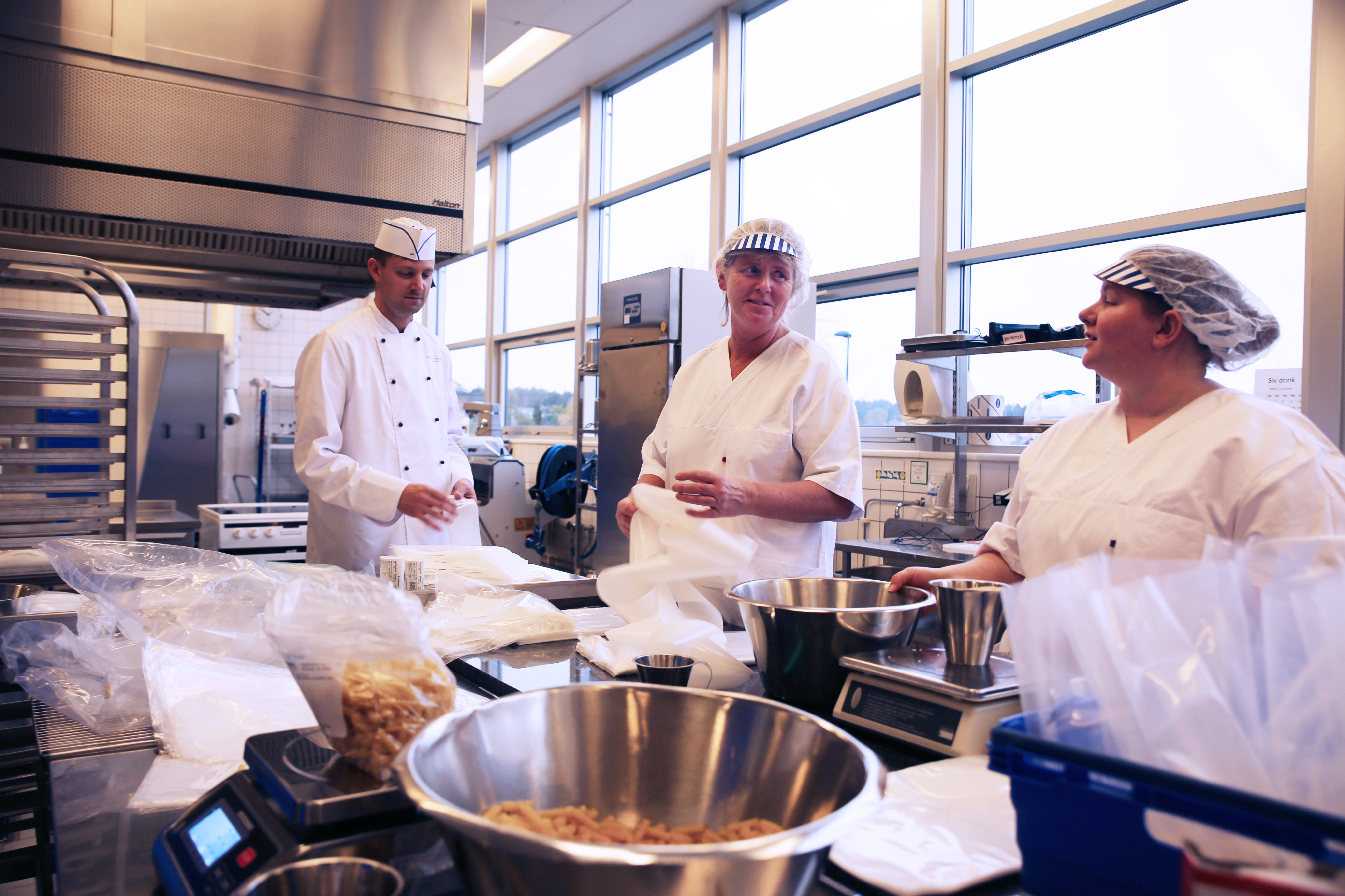 STORPRODUKSJON: Produksjonsansvarlig Elisabeth Kettilsen (til venstre), produksjonskjøkkenets leder Hege Eftedal og Bjørnar Aske bidrar i produksjonen av den gode maten ved Sykehuset i Vestfold.